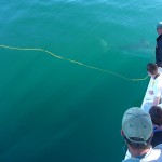 Enigszins pessimistisch stapten we na onze rit naar Gansbaai en ontbijtje in de boot richting Dyer Island, waar veel witte haaien op doortocht zich komen voeden met de zeehonden die daar op ‘Geyser rock’ rondhangen en zwemmen. Het weer was heerlijk en dus zaten we in ons t-shirtje op het bovendek van de boot te zonnen. Het aas werd uitgegooid en het wachten op haaien was begonnen. Zouden ze zich deze keer dan wel laten zien??